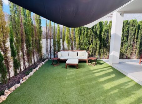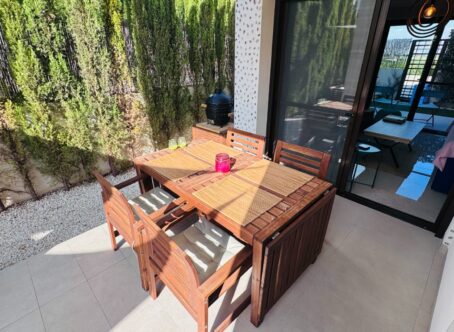 2-Bedroom Ground Floor Apartment, Los Lagos – La Finca Golf, Algorfa This well-presented two-bedroom ground floor apartment is located on the desirable Los Lagos development at La Finca Golf, Algorfa. Owned since new and tastefully upgraded over the last five years, the property is an ideal lock-up-and-leave holiday home or comfortable permanent residence. At the front of the apartment, there is off-road parking for one vehicle and a lovely east-facing courtyard garden with scenic mountain and orange grove views. Inside, the bright open-plan living and dining area features patio doors leading to both the front and rear gardens. The modern kitchen is fully equipped with wall and base units, integrated oven, hob, extractor, dishwasher, washing machine, and fridge freezer. A handy storage cupboard houses the water boiler. Both bedrooms are spacious and light, each with floor-to-ceiling built-in wardrobes. The master bedroom includes an ensuite shower room and access to the rear garden, while the second bedroom opens onto the front garden. To the rear, you’ll find a covered terrace with a BBQ area, ideal for outdoor dining and entertaining. The garden provides ample space for sun loungers and shaded areas for relaxing. Residents benefit from access to a beautiful communal pool and landscaped gardens, located just behind the apartment. The property is sold fully furnished and includes air conditioning throughout and an alarm system for added peace of mind. Located within walking distance of the La Finca Golf Spa Hotel and the golf clubhouse, residents can enjoy a range of restaurants and a welcoming bar overlooking the course. The nearby La Finca commercial centre offers additional dining options. The main motorway is only five minutes away, providing quick access to Elche, Alicante, and Alicante Airport (approximately 40 minutes). The nearest beach is just a short drive away. Contact us today to arrange your viewing.