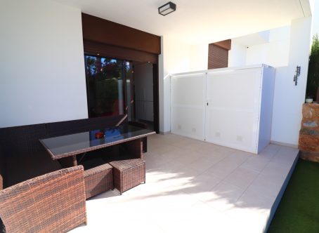 This west-facing two-bedroom ground floor apartment is located within the exclusive La Finca Resort - home to the renowned La Finca Golf & Spa Resort - one of the most prestigious destinations on the Costa Blanca South. A selection of bars, shops, and restaurants can be reached within a pleasant 15-minute walk, while the charming village of Algorfa is just five minutes by car. The towns of Almoradí and Benijófar are approximately 10 minutes away, and the beautiful beaches of the Costa Blanca - including those along Orihuela Costa - can be reached in around 20 minutes. Interior & Layout The property offers a bright, spacious open-plan living and dining area with double sliding glazed doors leading out to a rear garden and covered terrace. A second set of glazed doors opens onto the front garden, which also features a partly covered terrace - ideal for outdoor dining, sunbathing, or relaxing in privacy. The sleek modern fitted kitchen is both stylish and functional, complementing the contemporary design throughout the home. There are two comfortable double bedrooms, both with built-in wardrobes and direct garden access - a rare and desirable feature that enhances indoor-outdoor living. The apartment also benefits from two modern shower rooms, one of which is en suite to the master bedroom. Outdoor Space The gardens have been thoughtfully landscaped for low maintenance while maintaining visual appeal and privacy. Features include: Tiled seating areas Decorative pebbled sections Artificial grass (astro turf) Attractive fern borders for natural screening Covered terraces to both front and rear Additional Features Air conditioning Irrigation system Access to a beautifully maintained communal swimming pool Prestigious golf resort setting An Exceptional Costa Blanca Property Combining stylish modern living, generous outdoor space, and a prime location within a luxury golf and spa resort, this apartment is perfectly suited as a holiday home, rental investment, or permanent residence. A superb opportunity to enjoy resort-style living in one of the Costa Blanca South’s most sought-after locations.