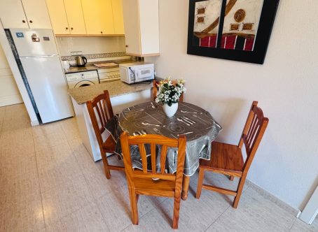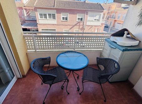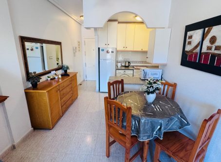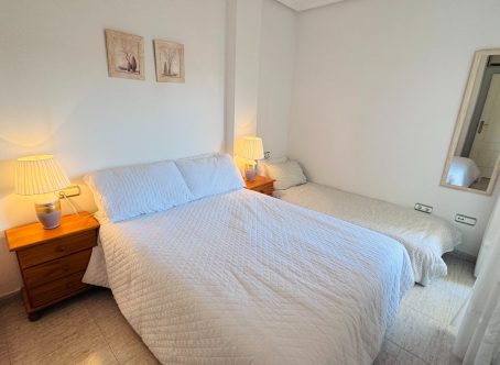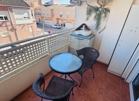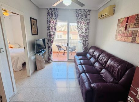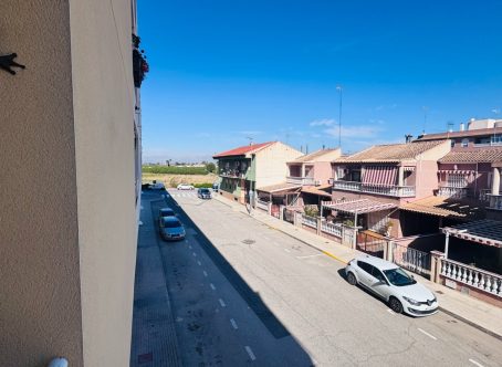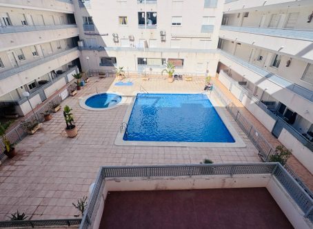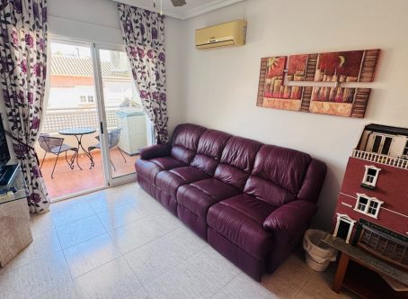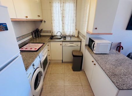 This well-presented 2-bedroom first-floor apartment is ideally located in the popular town of Almoradí, within easy walking distance of Mercadona supermarket, bars, restaurants, and all essential amenities. Situated within a secure and well-maintained residential complex, the property benefits from a welcoming communal entrance with post boxes, lift access to all floors, and both ramp and step access-making it suitable for those with reduced mobility. On the ground floor, residents can enjoy two communal swimming pools with ample space for sunbathing and relaxation. The apartment itself offers a bright and practical layout. Upon entering, there is a modern refitted shower room, followed by an open-plan kitchen fully equipped with oven, hob, fridge freezer, washing machine, and dishwasher. The kitchen flows seamlessly into the main living area, creating a comfortable and sociable space. Patio doors from the lounge lead onto a sunny private terrace, which is also accessible from the main bedroom and enjoys pleasant side mountain views-ideal for outdoor dining or relaxing. Both bedrooms are well-proportioned, with the master bedroom featuring fitted wardrobes and direct access to the terrace. Air conditioning is installed in the living area and main bedroom for added comfort. The property is sold furnished, making it a perfect “lock-up-and-leave” holiday home or a low-maintenance permanent residence. There is also ample on-street parking available nearby. Almoradí offers a vibrant local lifestyle with shops, restaurants, schools, and a medical centre all within walking distance. The renowned Saturday street market is just a short stroll away, providing a fantastic opportunity to experience the town’s lively atmosphere, while the charming plaza and church area add to its traditional Spanish appeal.