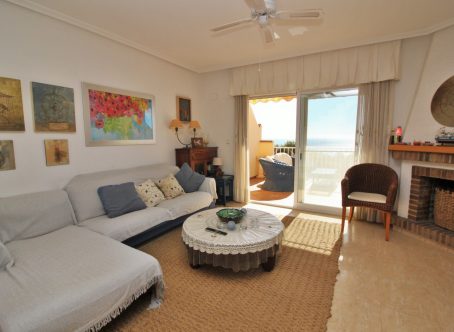 FIRST-LINE sea 3 bedroom duplex property with AMAZING sea views in the gated community of Las Terrazas. Situated in arguably one of the best locations in Orihuela Costa, nestled between Cabo Roig and Campoamor, this fabulous property offers a very generous living space, and is only metres away from the beaches of Aguamarina & Campoamor (La Glea). The duplex is divided over 2 floors, with the main level comprising of a well-appointed living room with fireplace, with access to a large South facing balcony with beautiful sea views, a fully fitted kitchen with utility room, and family bathroom with walk-in shower. On the first floor there are 3 bedrooms and family bathroom. Two bedrooms offer stunning, uninterrupted sea view across the Mediterranean while the third bedroom offers a view of the beautiful communal gardens and swimming pool to the rear of the property. A private underground parking space is included in the price.The property is situated on a prestigious gated development on the frontline to the coast. The development offers a beautiful communal swimming pool set in landscaped gardens immediately to the rear of the property, with ample space to enjoy the summer sunshine. Just a few minutes’ walk to the beach, as well as the popular Cabo Roig strip, which offers an abundance of services, including a supermarket, medical centre, pharmacy, and many bars and restaurants. This property really is in the perfect location! Contact us today to arrange your viewing.