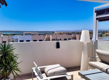 Ciudad Quesada, Doña Pepa, luxury top floor bungalow with 2 bedrooms and 2 bathrooms, 80 m2, with solarium (73m2) with views to the salt lakes, open plan kitchen, living room with fireplace, jacuzzi, summer kitchen, air conditioning, storage room, terrace, sold equipped and furnished.~