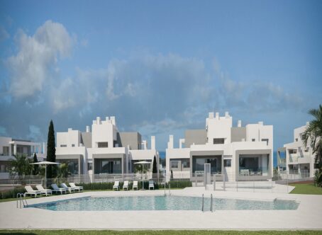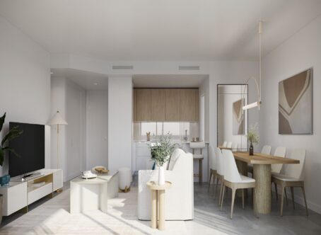 New Apartment in a central location within easy reach of the beach and other amenities such as an international school. This apartment includes 1 garage space and 1 store room. The development has three swimming pools for adults and three separate children’s paddling pools, gardens and greenzones. Furthermore, it will also have a fully equipped gym, co-working area, spa, cinema, youth club and accesibility ramps. The specifications include fully equipped kitchens, bathrooms with thermostatic tapware, resin shower trays, fitted wardrobes, and walls with noise insulation. The windows have aluminium profile carpentry with thermal bridge break, double-glazing with air chamber and motorised aluminium blinds in bedrooms. The apartment is equipped with a high energy efficiency aerothermal system, air-conditioning for heating and cooling, and drains with sound-buffering PVC downpipes.