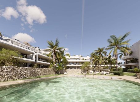 New Development: Prices from 389,000 € to 479,000 €. [Beds: 1 - 2] [Baths: 1 - 2] [Built size: 51.00 m2 - 55.00 m2] This is not simply a place to live. It's a lifestyle ecosystem. From sunrise swims in your private pool to sunset walks along the coastal path, this is more than just a home — it's a statement. Located in the vibrant heart of Estepona's emerging west side, this thoughtfully designed, low-density development introduces a collection of 78 luxurious 1, 2, 3, and 4-bedroom apartments, brought to life with vision and care. Surrounded by lush vegetation and bathed in natural light, each residence offers a personal retreat from the ordinary. There's a quiet elegance to the interiors here. A soothing palette of neutral tones, natural textures of wood and stone, and flowing spaces with floor-to-ceiling glass doors that dissolve the boundary between indoors and out. Architecture in this enclave enhances the natural surroundings. Smart orientation and low-density planning ensure optimal privacy, abundant sunlight, and expansive green views. Each apartment harmonizes with its environment. Sculptural yet understated, curved terraces mimic the coastline's natural rhythm, while communal areas are deeply rooted in nature, featuring green roofs, layered planting, and the gentle shade of palm trees. This development offers resort-style amenities, discreetly integrated into the landscape. A tranquil spa hidden behind flowering stone walls, a serene coworking space with garden views and filtered light, and a fitness suite where glass walls reveal trees instead of treadmills. Start your day with a peaceful swim in the heated indoor pool or recharge in the refreshing outdoor saltwater pool. Unwind in the spa with a sense of stillness that money can't buy, or share a fireside drink with like-minded neighbours as the evening sets in.