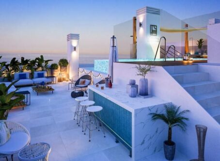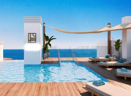This 2 bedroom apartment is located in a residential complex of 23 apartments. Sky lounge with private swimming pool and chillout area and parking spaces, located next to the sea, in the town centre of Estepona, next to all the services and leisure that the city has to offer. A parking space is included in the price. Enjoy the bustle of its streets, its restaurants, the marina, the old town, the Felipe VI auditorium, the orchidarium, the athletics stadium, the fairground... Only 70 metres from the 2,4-km. beach of La Rada, lined with typical chiringuitos. Wide selection of golf courses in the area, only 15 minutes away. Puerto Banús 25 minutes away.