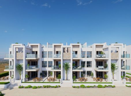 <strong> SPECIAL OFFERS APPLY – contact us for more information</strong>.Ready around October 2027 and built to extremely high standards, there are two and three bedroom options here. Located on Serena Golf Resort close to the beach and the town of Los Alcazares, these apartments come with underground parking space, store room, community gym and sauna. They have a beach style community pool with jacuzzi area with balinese beds and also in the communal areas are two padel courts, kids play area and community WC. On entering the property there is an entrance hall with the family bathroom straight in front, off to the right is a double bedroom with fitted wardrobes. The lounge is a dood sized and has an open plan kitchen with island that comes with the white goods. The master bedroom has a walk through wardrobe area and en suite bathroom. Both the master bedroom and lounge have patio doors to the terrrace.