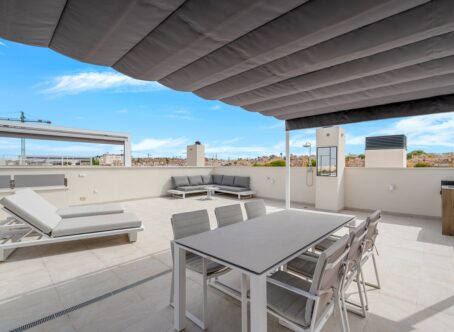 In the highly sought-after area of Los Altos, this stylish and fully furnished 2-bedroom, 2-bathroom penthouse is located in the brand-new Amanecer X residence. With a private roof terrace and sunny balcony, it’s the perfect spot to enjoy the Mediterranean lifestyle. Property Features: Approximately 71 m² of well-designed living space Bright open-plan living area connecting to a 21 m² balcony Large 80 m² solarium with two pergolas and side panels, ideal for sunbathing, entertaining, or relaxing in privacy Fully furnished with tasteful furniture and practical extras for a move-in-ready home Please note: outdoor kitchen and terrace furniture shown are not included but can be purchased separately Community Facilities: Swimming pool Gym Sauna Location Highlights: Prime location close to beaches, shops, and restaurants Combines convenience, comfort, and modern lifestyle on the Costa Blanca This penthouse is ideal for anyone seeking a modern, turnkey home in a desirable area with excellent amenities and outdoor space.
