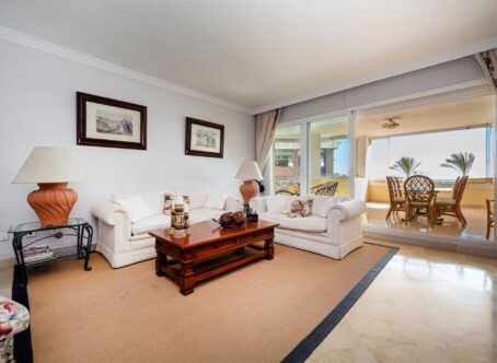 Front line beach apartment in La Herradura. Second floor, facing south to east. Direct views to the beach and sea, walking distance to Puerto Banus. Living and dining area, fitted kitchen, spacious master bedroom en suite, plus one guest bedroom and bathroom. Direct access to the covered terrace with glass curtains. Garage space and storage/bedroom with bathroom and daylight. Community pool and gardens, direct access to the beach.