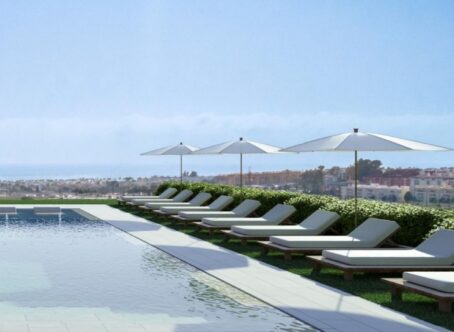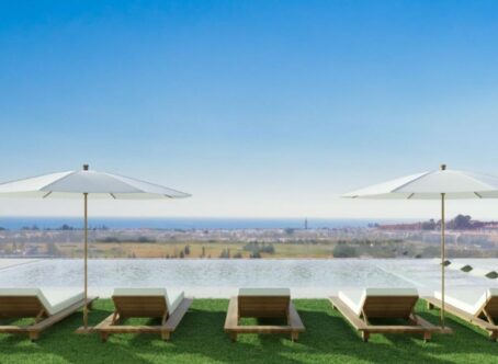 Apartment in Nueva Andalucia with the following finishes: • Armored entrance door and white lacquered interior carpentry. • White lacquered built-in wardrobes and lined inside. • Large format and 1st quality porcelain stoneware in kitchen and bathroom floors. • Fully equipped kitchens with high energy rating appliances. • Porcelain sanitary ware with large format shower. It has an overflowing pool with night lighting and saline chlorination on roof deck. Large solarium area, with green area and views of the pool. Fully equipped gym overlooking the garden, to be always in shape without having to leave the building. Spacious furnished and equipped lobby. A space designed to be able to have a relaxing drink in the company of friends and family. Large equipped leisure area with sun loungers to relax in the sun, or share pleasant moments of relaxation in an enabled area.