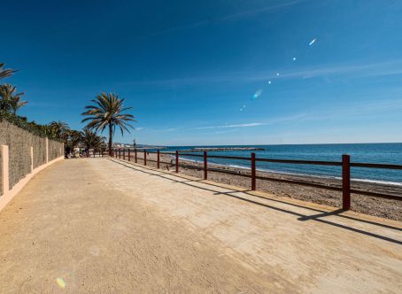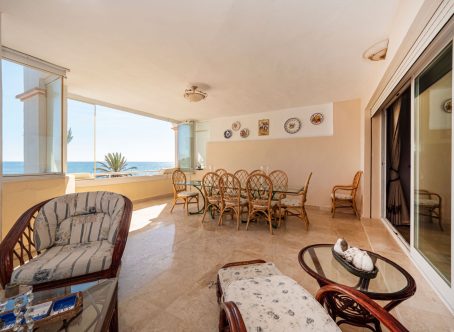 Front line beach apartment in La Herradura. Second floor, facing south to east. Direct views to the beach and sea, walking distance to Puerto Banus. Living and dining area, fitted kitchen, spacious master bedroom en suite, plus one guest bedroom and bathroom. Direct access to the covered terrace with glass curtains. Garage space and storage/bedroom with bathroom and daylight. Community pool and gardens, direct access to the beach.