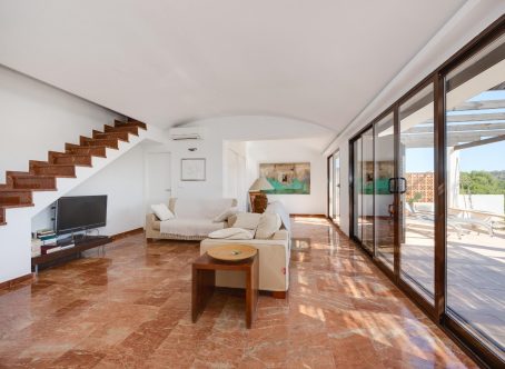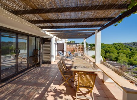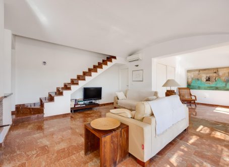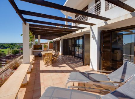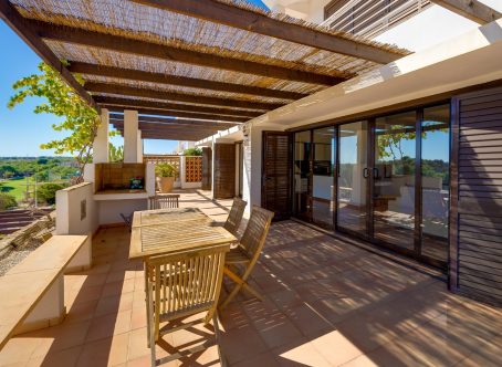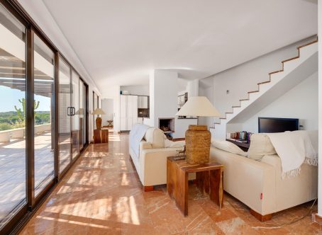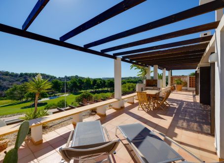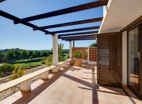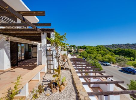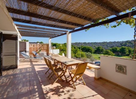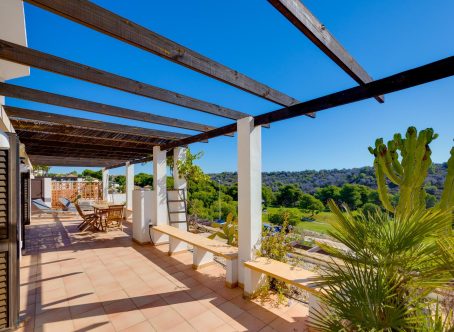 We present this exclusive duplex penthouse built in the year 2000 with high-quality materials and maintained in excellent condition. The property is ready to move into with no renovations required. It is ideally located facing the Las Ramblas Golf Course, offering a quiet, safe, and prestigious setting. From the spacious 40 m² terrace, which is directly connected to the interior living space, the property enjoys beautiful open views over the greenery and the golf course. The home benefits from abundant natural light throughout. On the main floor, there is a large living-dining room with a fireplace, an open-plan kitchen, and a reading area that was originally designed as a third bedroom. There is also a double bedroom with an en-suite bathroom, as well as a guest toilet. The upper floor features another en-suite bedroom with direct access to the private solarium. This impressive 45 m² outdoor space offers panoramic views, including distant views of the Mediterranean Sea. A closed garage space of 25 m² is available for purchase at an additional cost of €15,000. The property is located near the Villamartin canal, allowing easy walking access to La Fuente Shopping Centre in approximately ten minutes. The area is surrounded by a wide range of amenities, including supermarkets, restaurants, and shops. This is a unique opportunity to acquire a high-quality penthouse in one of the most desirable areas of the Costa Blanca.