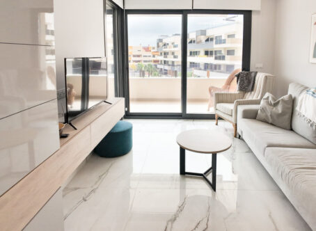 A South facing 2 bedroom 2 bathroom apartment with views to the communal swimming pool located in Res. Sunrise Deluxe, Playa Flamenca, Costa Blanca. This luxury apartment is offered for sale in very good condition, sold furnshed & very briefly consist of the following :- Lounge / diner, open plan fully fitted kitchen, 2 x double bedrooms, the main bedroom has an en suite shower room, 1 x guest shower room, balcony with views to the communal swimming pool & down to the sea, communal jacuzzi, sauna, gymnasium, childrens playa area, underground parking space & store room, ultra modern design, top class building materials & much more. This stunning apartment comes fully furnished, with all kitchen appliances & with hot & cold air conditioning installed. This lovely property is only 500m from the amazing beaches of Playa Flamenca and within short walking distance to the Citrus Commercial Centre & the Flamenca Beach Commercial Centre & just a few minutes drive to the popular Zenia Boulevard shopping center with 150 shops, bars and restaurants. There are 4 golf courses all within a 10 minute drive & Murcia Corvera airport is a 35 minute drive & Alicante airport is a 50 minute drive.