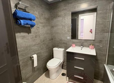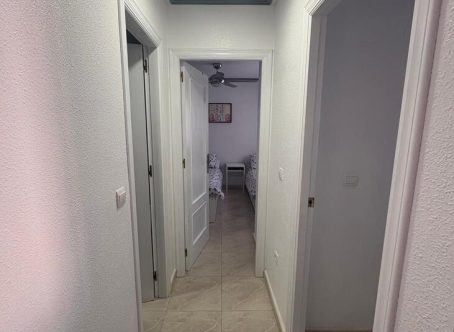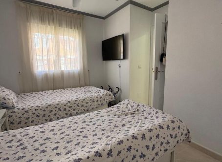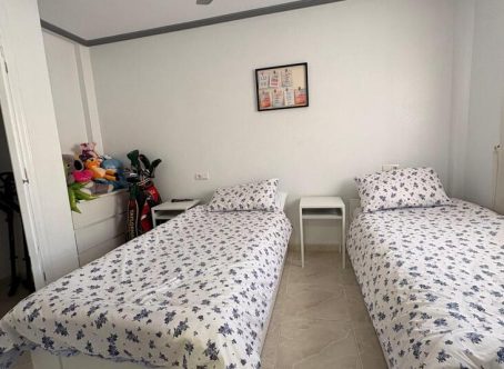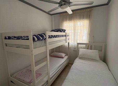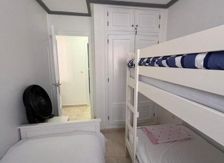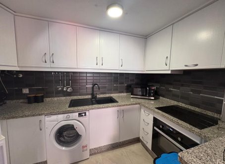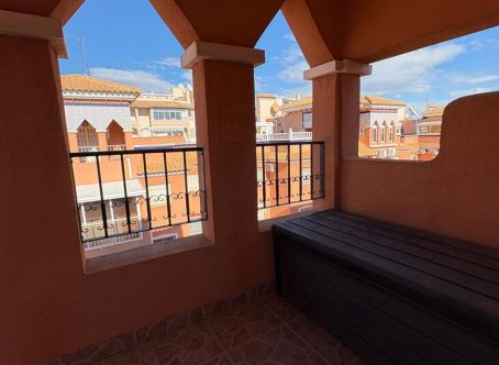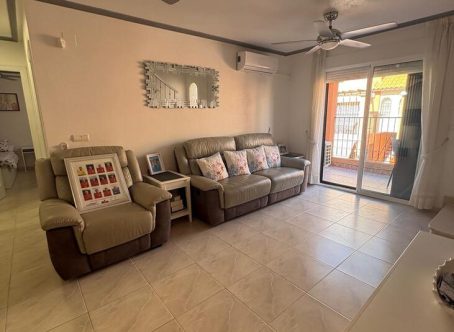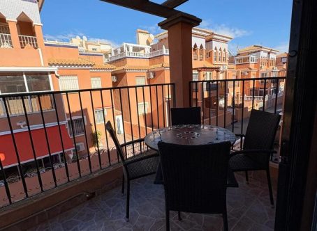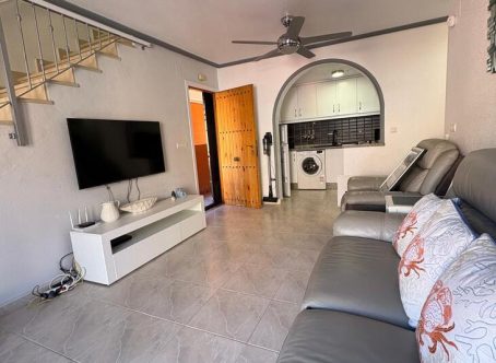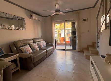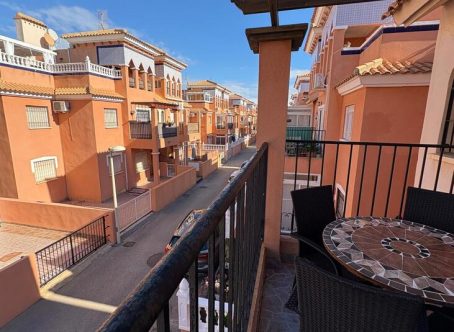 Modernised Duplex Apartment with West-Facing Solarium – Parque del Duque, Playa Flamenca This beautifully modernised three-bedroom, two-bathroom first-floor duplex apartment is situated within the highly sought-after gated urbanisation of Parque del Duque in Playa Flamenca, just a short walk from shops, restaurants, and local amenities. The property is sold fully furnished, including all white goods, and features a contemporary fully fitted kitchen. The bright and spacious living room benefits from air conditioning and opens via patio doors onto a private balcony, with an internal staircase leading to the upper level. On the main floor, there are two generous twin bedrooms, both with fitted wardrobes and ceiling fans, along with a stylish family bathroom featuring a full-sized bath with shower over. The upper level is dedicated to the impressive master bedroom suite, complete with air conditioning, an en-suite bathroom, and direct access to a private balcony. From here, you can step out onto a spacious corner, west-facing roof solarium-an ideal space for relaxing or entertaining while enjoying pleasant views over the communal pool. Additional features include security grills on both patio doors, shutters on all windows, and air conditioning in the living room and master bedroom, ensuring year-round comfort and peace of mind.The well-maintained gated community offers excellent communal facilities, including a large swimming pool, football pitch, children’s play area, ping-pong tables, and planned outdoor gym equipment, making this property ideal for both permanent living and holiday use.