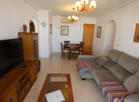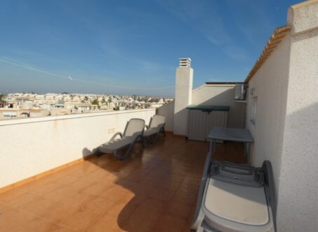 A beautifully presented 3-bedroom, 2-bathroom top-floor apartment with a private rooftop solarium, located in the sought-after Residencial Laguna Golf, Playa Flamenca on the Costa Blanca. Offered for sale in good condition, this bright and inviting home comprises: Spacious lounge/dining area Open-plan, fully fitted kitchen Separate utility room Two double bedrooms with fitted wardrobes, including a master bedroom with en-suite bathroom Modern guest shower room Glazed-in balcony for year-round use Internal staircase leading to the third bedroom and the impressive private rooftop solarium, perfect for sunbathing and entertaining Set within a secure gated community, residents enjoy superb facilities including a lovely communal swimming pool, landscaped gardens, children’s play area, tennis courts, football pitch, tropical pond and more. The property also includes an underground parking space and storage room. Ideally situated, this home is just 5 minutes’ walk from local bars, restaurants and the popular Saturday street market. The beautiful Orihuela Costa beaches are only a 5-minute drive away, or a 25-minute walk to Playa Flamenca beach. Alicante Airport is conveniently reached within 50 minutes.