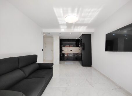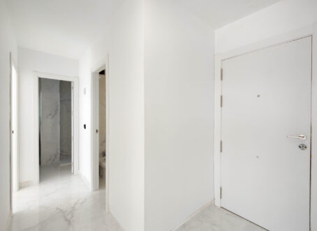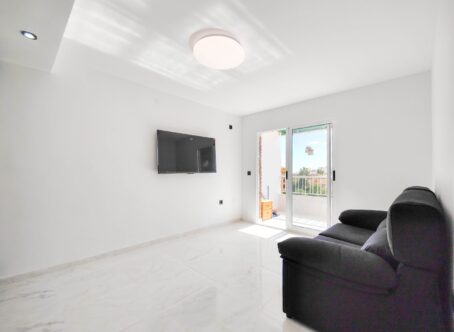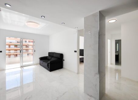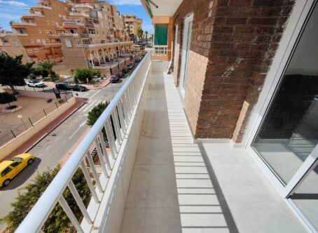 Beautiful completely renovated south facing apartment with views over the swimming pool for sale in Rocío del Mar – Punta Prima – Torrevieja. Located in a building with elevator, covered and fenced parking for residents and a huge communal swimming pool with lifeguard. Very well kept building.This wonderful apartment has been completely renovated, including electrical installation and plumbing, ready to move into.The apartment has 2 large bedrooms with fitted wardrobes and access to the terrace, 2 bathrooms (both with shower), a bright living / dining room with a beautiful brand new integrated kitchen.The bedrooms and the terrace enjoy an excellent SOUTH orientation, which gives them a lot of natural light. From the terrace we have unobstructed views over the communal pool, ideal for keeping an eye on the children.OPTIONAL closed garage in the underground garage available if required.Privileged location, a few steps from the bars, restaurants, supermarkets and the beaches of Punta Prima.Do not miss the opportunity to buy this beautiful completely renovated south facing apartment with the best orientation and on the best location in Punta Prima!