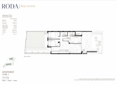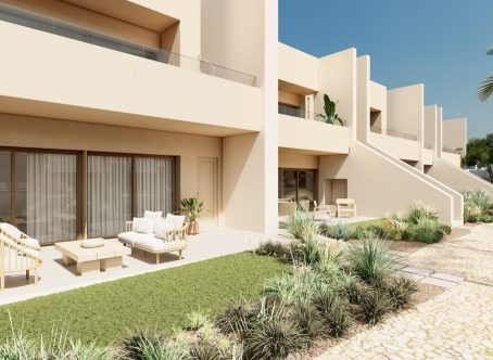 <strong>SPECIAL OFFERS APPLY - contact us for more information. </strong> Brand new apartments on the prestigious Roda Golf Resort which is located just 3kms to the beach and close to the bustling town on Los Narejos/Los Alcazares. On entering the property you will find a spacious 36m2 kitchen/diner, lounge. The kitchen comes with white goods and some of them come with a separate utility room.  There are three bedrooms with fitted wardrobes, the master bedroom is ensuite and there is a further family bathroom. All bedrooms have access to one of the two outside areas which come with this property. There is an exterior garden and terrace and an interior walled garden and terrace, in total around 101m2 of outside space to enjoy al fresco living. Other features are that they come with 1.5kw solar panel, storage room and pretty communal gardens and swimming pool.  There are motorized blinds and LED lights throughout.