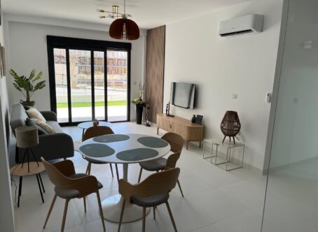 This modern 2 bedroom, 2 bathroom apartment is located in San Miguel de Salinas, in an excellent location close to all amenities and leisure areas. With a built area of 75 m², the house features a fully equipped open kitchen, a bright living room and two bedrooms, and access to a private veranda and a private garden overlooking the communal garden and swimming pool. Highlights: 2 built-in wardrobes Furnished Equipment included Air conditioning and pre-installation for air conditioning Secure door and intercom Located on the ground floor with easy access Ideal location: Only 15 minutes from the beach 40 minutes from the airport 10 minutes from the golf course 10 minutes from recreational areas and amenities Perfect for both permanent living and holidays. Ready to move in!