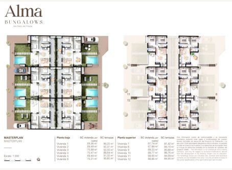 <strong>SPECIAL OFFERS APPLY - contact us for more information. </strong> Located in an enviable position just 850m from the beach and lots of great restaurants like Rubio 360 and Venezuela, you also have all the amenities you need and transport links at your finger tips. No need to share a communal pool as each apartment has their own private pool. On entering the garden from the street you will find a 65m2 terraced and astro-turfed garden with a south easterly aspect and your own private pool. Inside is a 29m2 open plan kitchen lounge diner with lots of light due to patio doors to the front terrace and further patio doors to the 29m2 rear terrace. The kitchen comes with Bosch white goods and there are internal and external LEDS. Both bedrooms have patio doors to one of the terraces and fitted wardrobes, the master bedroom has an ensuite bathroom and there is a further family bathroom. There are also top floors available with private pools on their roof solariums, drive way parking and a store room with bike rack.