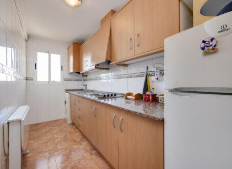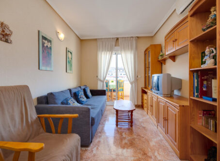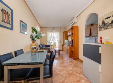 This well-presented 2-bedroom, 1-bathroom apartment is ideally located in the centre of Torrevieja, offering excellent convenience and easy access to all local amenities. Situated on the 3rd floor of a well-maintained building with a lift, the property is south facing, ensuring plenty of natural light throughout the day. The apartment features a bright lounge/dining area with access to a private balcony, a separate fully fitted kitchen, two comfortable bedrooms, and a complete family bathroom. It is being sold in good condition and comes fully furnished, making it ready to enjoy from day one. Additional benefits include hot and cold air conditioning, use of a communal swimming pool, and a private garage space included in the price. The building was constructed in 2003 and is located close to shops, restaurants, public transport, and the town’s main attractions. A fantastic opportunity for permanent living, holidays, or rental investment in the heart of Torrevieja.