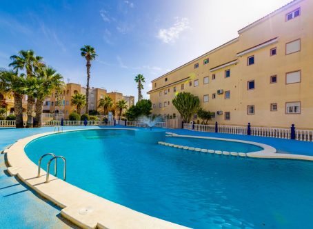 Charming corner ground-floor apartment located in a peaceful residential area surrounded by nature, just a 10-minute drive from the town center. The property offers three bedrooms, one bathroom, an open-plan kitchen, and a spacious enclosed terrace with views over the communal pool-ideal for creating an additional living area or simply relaxing in the sun. Thanks to its excellent orientation, the apartment enjoys abundant natural light throughout the day, creating a bright and welcoming atmosphere. Residents also benefit from a rooftop communal solarium with stunning views of the area’s two lakes. The gated complex features a swimming pool, private parking, electronic access, and a bus stop conveniently located at the entrance. The Dunas forest and nearby lake are only a five-minute walk away, perfect for nature lovers and outdoor activities. An excellent option as a permanent residence, holiday home, or investment opportunity. Viewing is highly recommended.