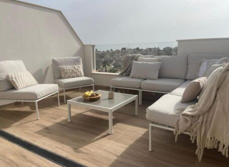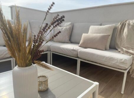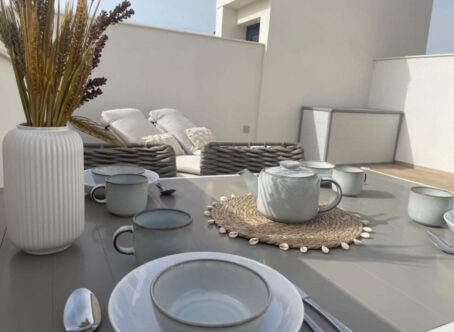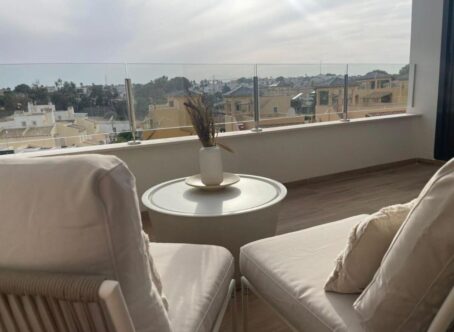 This modern penthouse apartment with 2 bedrooms, 2 bathrooms is situated in Villamartin, Alicante set in a great location only a few minutes walk to all local amenities (restaurants, bars and shops). The fantastic La Zenia beach and La Zenia Boulevard shopping centre is also a 10 minute drive. Villamartin Plaza and Villamartin Golf are less than 4 minutes away. The property is comprised of a spacious lounge area, an open plan kitchen/dining area, electric shutters, air conditioning (hot/cold) throughout the property, a main bedroom with fitted wardrobes and en-suite bathroom, a further guest bedroom with fitted wardrobes and a second bathroom with walk-in shower. Patio doors lead out onto a private terrace (with small utility room) to enjoy the sun all day and there is a large rooftop terrace/solarium with amazing views. Private allocated parking space is also included. There is a lovely communal green area with communal swimming pool, petanque zone, children's playground and a beautiful communal park. These apartments are fantastic value for money and the location is great with the bars, restaurants and amenities only a short walk away. The Villamartin area is very popular with tourists and most of the population consists of Western European expatriate communities who have settled there in the last 10 years, virtually transforming the village into a modern-looking town. There are also other golf courses nearby and numerous white sandy beaches.