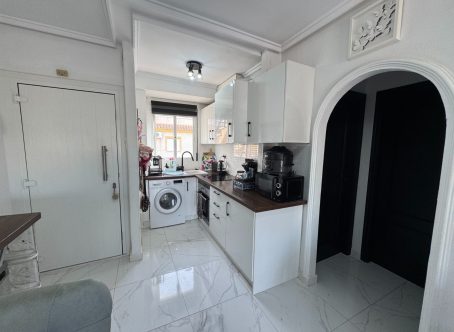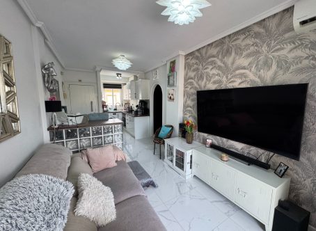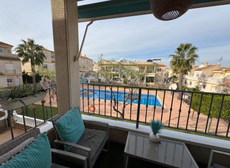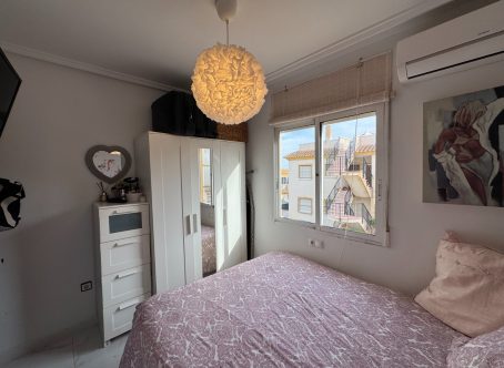 This wonderful top-floor apartment is located in the highly sought-after St James Hill area, within a secure community accessed via communal electric gates. Offering two bedrooms and one bathroom, this beautifully presented property combines comfort, style, and convenience in a prime location. Upon entering, you are greeted by a bright and spacious open-plan living area, seamlessly connected to a fully fitted modern kitchen with integrated appliances. Large windows and patio doors fill the space with natural light and lead directly onto a private terrace overlooking the communal swimming pool-perfect for relaxing or entertaining. The apartment is south-facing and benefits from hot and cold air conditioning throughout, ensuring year-round comfort. It is fully furnished with high-quality furniture, fixtures, and fittings, complemented by elegant white porcelain flooring throughout. The smaller bedroom is generously sized and currently accommodates a king-size bed, while still comfortably fitting a standard double. It features a large window allowing ample natural light. The stylish bathroom includes a walk-in shower and a modern vanity unit. The larger bedroom, also south-facing, features fitted wardrobes and offers views over the communal pool. A standout feature of this property is the private rooftop solarium, fully equipped with a bar and sunbathing area-ideal for enjoying Mediterranean evenings in style. Additional benefits include a designated private parking space. This apartment is perfectly suited as a permanent residence, a holiday home, or a lock-up-and-leave investment with excellent rental potential. The location is exceptional, with La Fuente Commercial Centre within walking distance, offering a wide selection of bars, restaurants, pharmacies, and supermarkets. Three renowned golf courses are also nearby.