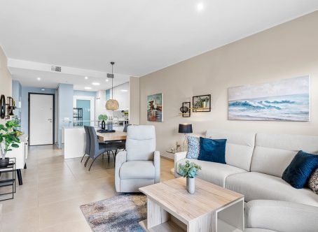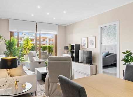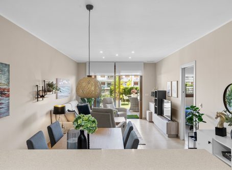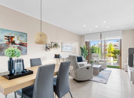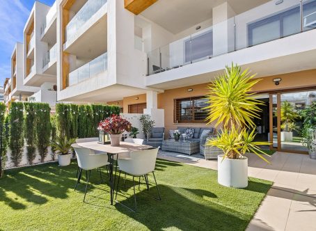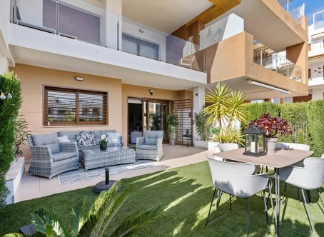 Elegant Ground-Floor Apartment with Private Garden – Los Dolses, Orihuela Costa This elegant and well-maintained ground-floor apartment in the prestigious area of Los Dolses combines a functional layout, high-quality finishes, and a privileged position within a premium residential complex. The property boasts a 75 m² private garden, providing a perfect outdoor space to relax, entertain, or enjoy the Mediterranean climate. Inside, the apartment offers: 2 bedrooms 2 bathrooms with underfloor heating and towel warmers Fully equipped modern kitchen Living-dining area with stylish downlights Hallway, laundry room, and storage room Comfort is guaranteed year-round with hot and cold A/C installed in every room for heating and cooling. The apartment comes fully equipped with a complete set of appliances, including fridge-freezer, stove, microwave, dishwasher, washing machine, and vacuum cleaner, as well as TV, WiFi, and bedroom TV points. It is delivered fully furnished, ready for immediate use. The private outdoor space is complemented by: A dedicated parking space within the complex Outdoor areas by the pool and at the entrance Low-maintenance artificial grass and automatic irrigation for planted areas Residents of this premium complex enjoy excellent communal facilities, including a large swimming pool, jacuzzi, children’s playground, and a bocce court, creating a safe and enjoyable environment for all. Located in the well-established Los Dolses area, the property is surrounded by supermarkets, restaurants, cafés, pharmacies, and shops within walking distance. It is also close to La Zenia Boulevard, several prestigious golf courses, and the beautiful Orihuela Costa beaches, making it an ideal choice for permanent living or a holiday retreat.