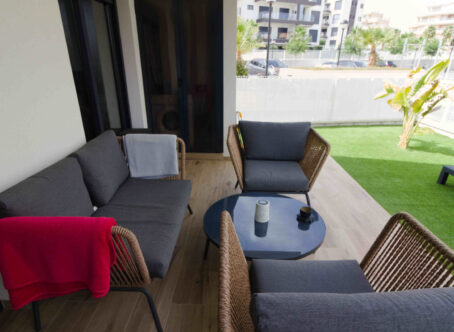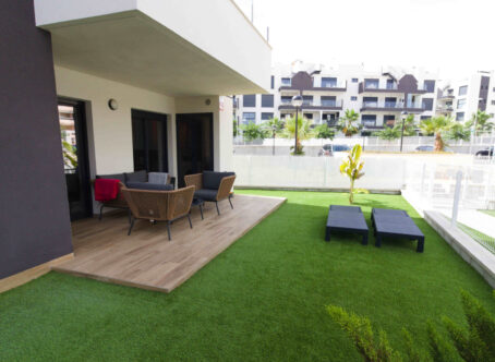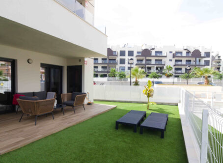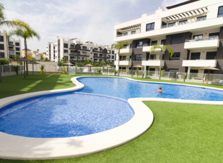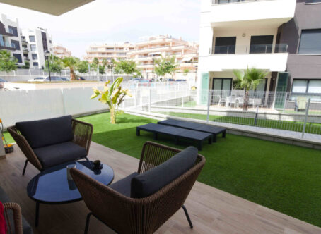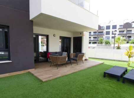 A luxury 2 bed 2 bath ground floor corner apartment located in Res. Valentino Golf III, Villamartin, Costa Blanca. This lovely modern style property is offered for sale in very good condition & very briefly consists of the following:- Light & airy lounge/diner with doors onto the covered terrace, front & side garden, open plan fully fitted kitchen, 1 x main bedroom with fitted wardrobes & an en-suite shower room, 1 x twin bedroom, 1 x family shower room, communal swimming pool, communal parking , lift, a children's play area & much much more. This lovely property has very good rental potential. It is located around 5 minutes walk to local bars & restaurants & around 15 minutes walk to the famous Villamartin Plaza & Golf Course where you will find numerous bars, shops & restaurants, less than 5 minutes drive to a further 3 golf courses & less than 10 minutes drive to the fantastic La Zenia beach or you can use the new local bus service. The Zenia Boulevard shopping mall is also just 5 minutes drive. Alicante airport is a 50 minute drive & Murcia Corvera airport is 35 minutes drive.
