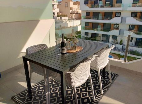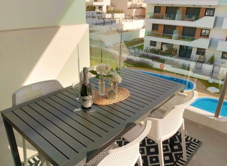Lovely Apartment in Residential Aire – Villamartin, Orihuela Costa Welcome to this delightful two-bedroom apartment in the picturesque area of Villamartin, on the Costa Blanca South. Combining comfort, modern living, and Mediterranean charm, this property offers the perfect retreat by the sea. Inviting Living Spaces The apartment features a bright, open layout with a total built area of approximately 70 m². The spacious living area is filled with natural light from large windows, creating a warm and welcoming atmosphere. The American-style kitchen integrates seamlessly with the living and dining area, ideal for both everyday living and entertaining. Comfortable Bedrooms There are two well-appointed bedrooms designed for relaxation and comfort. The master and guest bedrooms both offer generous space, complemented by two modern bathrooms for convenience and functionality. Outdoor Oasis Step outside to enjoy an 11 m² terrace, the perfect place to start your day with a coffee or unwind in the evening sun. A charming additional balcony provides even more outdoor space to enjoy the Mediterranean breeze. Community Amenities Residents benefit from access to a beautiful communal swimming pool, ideal for cooling off on warm days or socializing with neighbors. The property is sold fully furnished, ready for you to move in and start enjoying life on the Costa Blanca immediately. Practical Features Equipped with air conditioning for year-round comfort, the apartment also includes a garage and covered parking, offering secure and convenient vehicle storage. Energy Efficiency The property holds an energy rating of C, ensuring a balance of comfort and energy-conscious living. Location Highlights Located in Orihuela Costa, Alicante province, this home is surrounded by beautiful scenery, local culture, and a variety of leisure options. From pristine beaches and world-class golf courses to charming cafés and restaurants, Villamartin provides the ideal setting to experience the best of coastal living. Whether you’re seeking a permanent residence, holiday getaway, or investment opportunity, this apartment delivers a perfect mix of style, location, and lifestyle. Key Features 2 Bedrooms, 2 Bathrooms 70 m² Build Area 11 m² Terrace + Additional Balcony Communal Swimming Pool Fully Furnished and Move-In Ready Air Conditioning Garage and Covered Parking Energy Certificate: C Prime Location in Villamartin, Orihuela Costa