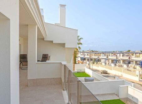 Discover Elevated Living in the Blue Lagoon Area Welcome to this exclusive residential oasis of just two sleek buildings, each offering six boutique units. Nestled in a tranquil setting, this stunning 2-bedroom, 2-bathroom penthouse combines modern luxury, breathtaking views, and outstanding efficiency. Modern Design and Unparalleled Views Step into a space where well-being, efficiency, and luminosity define your lifestyle. This 79 m² penthouse features an open-concept layout with large double-glazed windows that flood every corner with natural light. The highlight is the expansive 87 m² private rooftop terrace, offering panoramic views of the sea, salt lakes, and mountains. Enjoy more than 3,000 hours of sunshine a year, with majestic sunrises and stunning sunsets to frame your days. Designed for Comfort and Sustainability Luxury meets sustainability on the rooftop terrace, equipped with an outdoor kitchen, a spacious pergola with horizontal and vertical parasols, and 4100-watt solar panels to meet your energy needs. Additional features like a washing machine and fridge-freezer are discreetly housed on the terrace for ultimate convenience. Resort-Style Living Relax by the elegant communal pool, designed with your well-being and that of your family in mind. The complex also includes a private garage space and a storage room for added comfort and functionality. Fully Furnished and Move-In Ready This penthouse is offered fully furnished and in impeccable condition, ready for you to begin your new dream life. Key Features: 165 m² total build 79 m² usable)2 spacious bedrooms and 2 bathroomsPrivate garage space includedPrivate storage roomBuilt-in wardrobesAir conditioningCommunity pool and green areas A Perfect Retreat Escape the hustle and bustle and reconnect with your essence in this serene paradise. This is more than a home – it’s a lifestyle for those who value comfort, efficiency, and the beauty of nature. Blue Lagoon is calling – are you ready to answer? Book your viewing now!