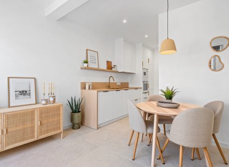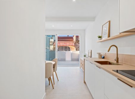 This modern and bright 59 m² property has been recently renovated and presents a carefully designed contemporary style with neutral finishes that enhance both warmth and a sense of space. The interior layout offers two bedrooms, one full bathroom, and a pleasant open-plan living and dining area with a fully equipped integrated kitchen. Seamlessly connected to the living space, the kitchen creates a functional and inviting environment ideal for everyday living. Large windows flood the home with natural light throughout the day, while the living room opens directly onto a private terrace-perfect for outdoor breakfasts or relaxing moments. The private area comprises a main bedroom with built-in wardrobes, a versatile second bedroom suitable for guests or a home office, and a separate laundry area that adds practicality and organisation. Situated in a quiet residential setting with independent street access, the property also benefits from an external staircase leading to a spectacular rooftop solarium. This expansive outdoor space is ideal for sunbathing, enjoying open views, or creating a stylish chill-out area.