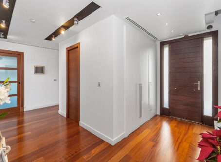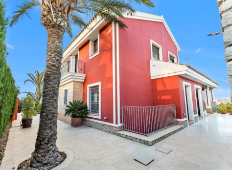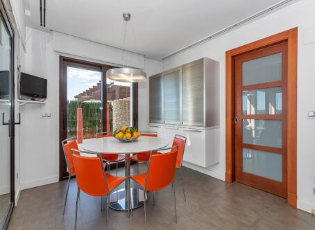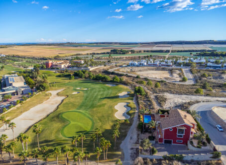 Detached villa on the first line of the golf course in La Finca. Discover this fantastic Mediterranean design villa in a privileged location. Villa with 721m2 built over 3 floors on a plot of 1150m2. On the ground floor, you will find an entrance hall and a guest toilet that lead to the spacious living room with a fireplace and views of the pool and golf course. It also has an independent kitchen and dining room. Finally, there is a spacious bedroom with an en-suite bathroom. On the upper floor, there is a large living room with access to the different rooms. On this second floor, you will find 3 bedrooms, 2 bathrooms, and 1 office with access to a large terrace overlooking the golf course. In the basement, there is a spacious bedroom, a home cinema, a pantry, a cellar, and a garage with space for 5 cars. Extras of the house: Quality furniture Under floor heating in ground floor and upper floor Air conditioning trough all the house 10x5 m swimming pool with electric cover 50m2 barbecue area Home automation Video surveillance Private entrance to the golf course La Finca Golf is definitely among the top 3 golf courses on the Costa Blanca. The course is constantly being upgraded and improved. Both the course and practice area is in perfect condition throughout the year. The resort as a whole has also grown to become the second most exclusive resort in the area. Inside the resort you will find the impressive golf clubhouse with restaurant and bar, a 5-star spa hotel, a complete sports facility, as well as a top Italian-Mexican restaurant. This very special property has an extraordinary location by the green on hole 10. The property is elevated on a hill with an extraordinary and unobstructed view and over the entire resort. In front of you you have the golf course, the spa hotel and the clubhouse. The property is also the only one with its own access directly to the golf course. Here you can drive your buggy out from your own garage.