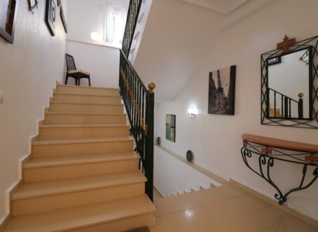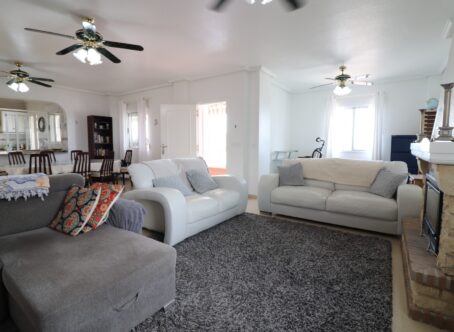 This Extremely Spacious, West Facing, Four Bedroom Detached Villa in Lomas de La Juliana is located on a prestigious Urbanization between Algorfa Village & La Finca Golf Resort, situated on a generous 1251m2 plot. This stunning property features four bedrooms and three bathrooms, including a luxurious master bedroom with an en suite bathroom that boasts a feature corner bath and shower. Both the master and the fourth bedroom have direct access to the first-floor terrace. Additionally, there is one toilet, off-road parking, a car port, and a garage. The villa offers a front glazed terrace where you can enjoy amazing panoramic country, mountain, and sunset views. The rear conservatory provides additional living space, while the open plan fully fitted kitchen comes with an adjoining utility room for added convenience. The spacious living area is equipped with air conditioning throughout, grills, a fireplace, and fitted wardrobes for ample storage. The exterior of the property is just as impressive, featuring a private heated swimming pool and a permanent gazebo for outdoor shaded dining, perfect for entertaining guests. There is also a BBQ area and a beautifully landscaped rear garden with terraces, trees, shrubs, and plants. The property includes 8 solar panels and 1 solar water panel, contributing to its energy efficiency. Security is a priority with CCTV and an alarm system installed. This villa's location offers the best of both worlds – a tranquil setting with a tennis club at the start of the urbanization, yet only a 5-minute drive to the nearest shops and amenities, and a 15-minute drive to the nearest beaches. This property truly represents a luxurious lifestyle in the heart of Costa Blanca South. 412m2 Build Size, Simply Wow!!! This property has a TOURIST LICENSE for short term holiday rentals. With a great track record of packed out summers by the current owner...