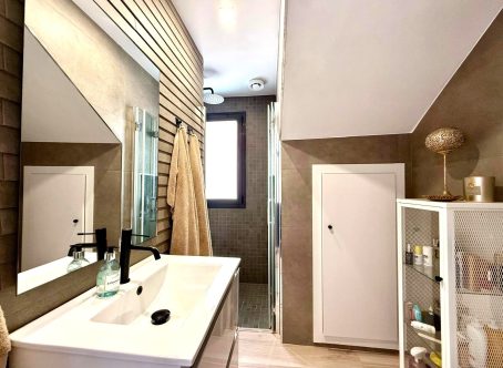 This modern and superbly presented detached villa is located within a gated residential community, just 1.5 km from supermarkets, restaurants, bars, and everyday amenities. Designed for contemporary living, the property offers both comfort and privacy. The villa opens into an entrance hall leading to a stylish open-plan kitchen, dining, and living area, with large doors providing seamless access to the sun terraces and the heated private swimming pool-ideal for both relaxation and entertaining. The ground floor also features a luxurious master bedroom with an en-suite bathroom, along with a separate laundry area for added convenience. On the upper level, there are two further double bedrooms and a well-appointed family bathroom, offering comfortable accommodation for family and guests. The property is sold partly furnished, subject to inventory, and benefits from its modern design, excellent condition, and secure gated setting.An ideal permanent residence or high-quality holiday home close to amenities.