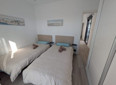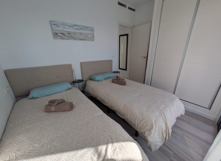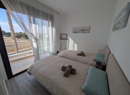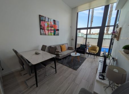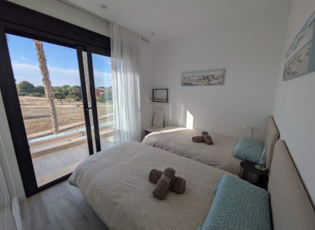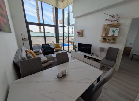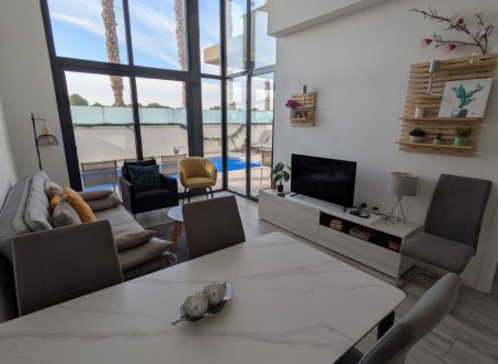 Ultra-Modern Detached House with Private Pool Discover this exclusive ultra-modern detached house, perfectly oriented southwest to capture the sun’s warmth throughout the day. Designed for contemporary living, this stunning home combines style, comfort, and practicality. The property features three spacious bedrooms and two stylish bathrooms, ideal for families or those seeking extra space. The living and dining area impresses with high ceilings and tall windows that fill the space with natural light, creating a bright and welcoming atmosphere. The modern open-plan kitchen is a chef’s dream, equipped with high-end appliances and ample storage. A separate utility room adds convenience for everyday living. Step outside to a low-maintenance garden and a private pool-perfect for relaxing or entertaining. Multiple terraces and a large solarium offer breathtaking open views and ample space for outdoor living. Additional features include full furnishings, centralized air conditioning, electric blinds, fitted wardrobes, a storage room, off-road parking, and a secure gated community. With 110 m² of constructed space, this property is in excellent condition and ready to move in. An exceptional opportunity to own a stylish, contemporary home in a prime location, offering privacy, comfort, and modern luxury.