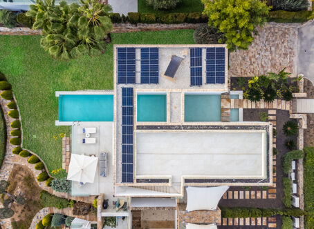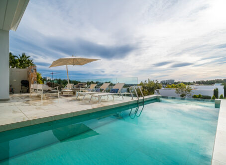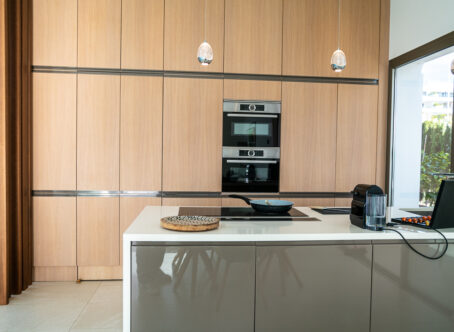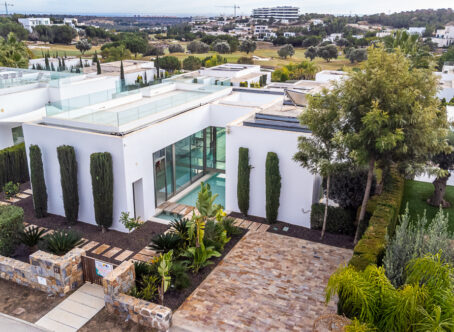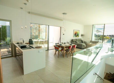 This luxury villa is located at Las Colinas Golf & Country resort located near Campoamor and the village of San Miguel de Salinas, 70 km south of Alicante. The golf resort is 330 hectares big and has besides the golf course a private beach club on the beach of Campoamor, a communal swimming pool, paddle fields, a fitness, tennis court, 2 nature trails and a mini supermarket. There are 3 restaurants: An Italian restaurant, a sushi restaurant and a club house with golf shop and changing room with showers. The entire domain is secured with its own security with camera surveillance at the entrance. The villa is located in the Limonero community which has direct access to the golf course. In front there are 2 private parking spaces and a beautiful front garden. Through the front door you enter the large living space with open kitchen, dining area, living room and a separate toilet with sink. The kitchen has all the necessary facilities and appliances (convection oven, dishwasher, microwave, fridge, 4 ceramic hobs and an air extraction system). Behind the kitchen there is a storage room with the necessary connections for the washing machine and dryer. Next to the kitchen there is a terrace with a table and chairs and a fireplace that is accessible through a sliding window. Through a glass walkway over the pool you enter the master bedroom with spacious built-in wardrobes and with private bathroom. Through the sliding window and the terrace at the bedroom you have direct access to the private pool. The large bathroom has a jacuzzi bath, a toilet, large walk-in shower and bathroom furniture with sink. Through the living space you can open the sliding windows completely so that you have direct access to the large terrace with a view of the golf and the sea. Through the terrace you can directly into the private pool that is located under the footbridge over the entire length of the house and can be beautifully lit in the evening. There is a BBQ area that can also be equipped with an outdoor kitchen and a shower. With the stairs up you come to the sun terrace with panoramic views over the golf with a view of the sea. On the ground floor there are 2 bedrooms with double bed and built-in wardrobes with sliding windows that have direct access to the terrace below and the large garden. There is also a bathroom with walk-in shower, toilet, bathroom furniture and sink. In addition, there is a large recreational room (mancave) and there are two large storage rooms where the technical installations for the swimming pool and the heat pump are located. The villa has all the necessary amenities: solar panels, air conditioning, alarm system, home automation system, internet and wifi. The house is sold including the furniture, but excluding the patio furniture and a few typical African pieces of furniture.
