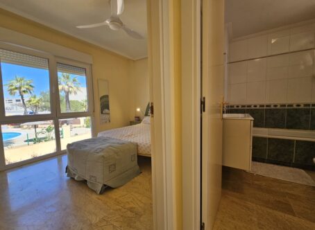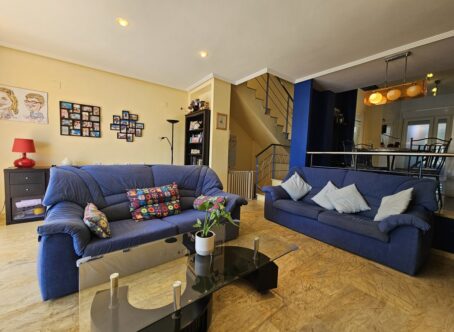 Rare opportunity to purchase this spectacular property in Calas de Campoamor with open sea views, just 100m from the beach. This 3 bedroom, 3 bathroom villa boasts a heated saline swimming pool installed less than 2 years ago along with a private solarium and underground garage and storage room. Located in a gated complex this property has been maintained to a very high standard with a sleek brand new kitchen and very attractive marble flooring throughout. On the ground floor there is fantastic living and dining room with floor to ceiling patio doors leading outside the the tiled terrace and swimming pool which has been finished with artificial grass. On the first floor you with find the master bedroom that enjoys sea views and en-suite bathroom along with two double guest bedrooms and the family bathroom all with views towards the sea or the communal swimming pool. On the top floor you will find the fabulous solarium with more stunning views of the Mediterranean and down towards the Mar Menor. The villa has an underground garage and storage accessed via an internal staircase, where you can conveniently access your car and exit the complex via electric doors. The house forms part of a well maintained complex where home owners also have use of the huge communal swimming pool and pretty garden. The property is sold as seen, fully furnished with many, many extras including independent laundry room, new air-conditioning units in the bedrooms, brand new kitchen appliances, non-chemical saline heated pool system, automated garage doors, intercom entry system, open fireplace in the living room and purpose built barbecue on the main terrace.Calas de Campoamor is a sought after location with all amenities within a few minutes walking distance including an international supermarket and bakery, 24hr pharmacy and medical centre along with a vast array of restaurants, cocktail and tapas bars.