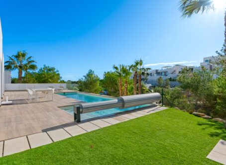 Located in the prestigious Las Colinas Golf & Country Club, one of the most exclusive resorts on the Costa Blanca, this breathtaking villa offers the perfect blend of modern design, high-end finishes, and ultimate living comfort. Designed to maximize enjoyment of the sun and nature, the villa features a southeast orientation and expansive windows that provide panoramic views of the lush surroundings. Upon entering, you are welcomed into a spacious and bright living area, where elegance and functionality blend seamlessly. The open kitchen, equipped with high-quality built-in appliances, flows effortlessly into the stylish living room-a perfect space to unwind in luxury or entertain guests in a sophisticated setting. Villa Layout The villa boasts an impressive master suite on the ground floor, complete with a spacious walk-in dressing room and a luxurious en-suite bathroom. Additionally, this level features two extra bedrooms, sharing a modern bathroom. Each of these rooms offers peace and privacy, with direct access to the outdoor spaces and stunning natural views. In the lower level, you will find an exclusive studio, ideal as a guest retreat or for added privacy. The studio includes a spacious bedroom, a stylish bathroom, and a private wellness area-a sanctuary where you can fully relax and recharge. Outdoor Living & Technology The southeast-facing garden is designed for ultimate outdoor enjoyment. The heated private pool invites you for a refreshing swim any time of the year, while the expansive terraces provide the perfect setting for long summer evenings. This villa is equipped with the latest modern technologies, including a smart home automation system, allowing you to easily control lighting, climate, and security. The Airzone climate control system ensures perfect indoor comfort in every room, while the automatic shutters provide extra convenience and privacy. Additionally, solar panels make this home more energy-efficient and sustainable. For your convenience, the villa offers a private parking area for two cars, ensuring a safe and comfortable space for your vehicles. Moreover, the property is fully furnished, including luxurious furniture worth €30,000-every detail is meticulously finished and ready for immediate move-in. Living in Las Colinas Golf & Country Club means enjoying a top-tier lifestyle. In addition to its award-winning golf course, the resort offers various sports facilities, fine dining restaurants, and a serene, secure environment. Furthermore, the stunning sandy beaches of the Costa Blanca are just a short drive away, allowing you to experience the best of both worlds-tranquility and exclusivity, with the Mediterranean Sea within easy reach. Are you looking for a luxurious villa with space, privacy, and an exceptional location? Contact us today to schedule a viewing and experience this unique living opportunity for yourself!