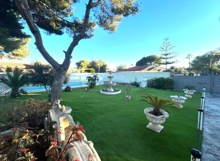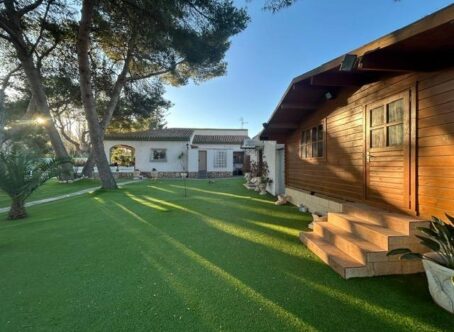 Beautiful and cozy villa located in one of the most beautiful areas of Orihuela Costa, in Dehesa de Campoamor. The house of about 200m2 built on the plot of almost 1500m2 is less than 900m from the beautiful beaches of Campoamor, within walking distance to the area where the tennis and paddle courts, the supermarket, the pharmacy, several bars and restaurants and other services are located. The villa built on the ground floor, we will find a total of 3 bedrooms and 2 bathrooms, the master bedroom with an en-suite bathroom and a large dressing room. Living room with fireplace, large independent kitchen, backyard with access to the laundry area and a nice front porch of about 20m2. In the well-kept and maintained garden we find a large private swimming pool (15x4) with a sliding transparent cover, a gym with a jacuzzi and a Finnish sauna, a wooden guest house with a small lounge, 2 bedrooms and a bathroom, and two other wooden houses, one with a bathroom that serves the garden and the swimming pool and a storage room. It also has a private garage for several vehicles and a barbecue area in the backyard of the house. It is sold furnished and equipped.