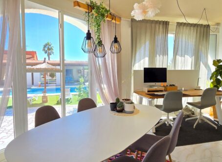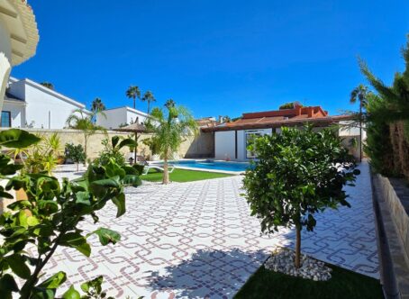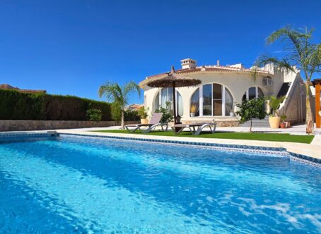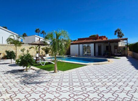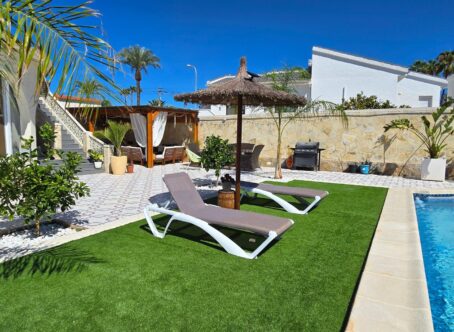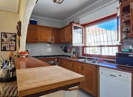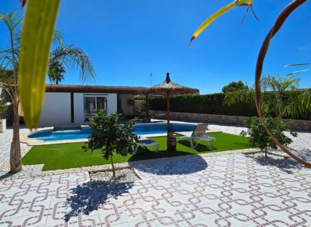 A 3 bed 2 bath detached villa with a separate 1 bed 1 bath apartment with a private swimming pool on a large 834m2 plot located in Ciudad Quesada, Costa Blanca. This property is offered for sale in very good condition, sold furnished & very briefly consists of the following :- This exquisite finca-style villa 160 m², complete with a guest house and private pool, is situated in the tranquil heart of Ciudad Quesada, within walking distance of the main street. Upon entering the fully enclosed 834 m² property, you will find a separate 36 m² garage on the right, featuring high ceilings suitable for accommodating a campervan. To the left, there is an integrated garage connected to the main house along with a storage room. The villa boasts a welcoming entrance that includes additional space suitable for an office. The living area is enhanced by a fireplace and an open-plan kitchen. It comprises three bedrooms, with the master suite offering a dressing room and an ensuite bathroom, in addition to another separate bathroom. At the rear, a recently glazed veranda extends the living space, providing lovely views of the private pool. The garden features a covered terrace with an outdoor bar, perfect for relaxation. A staircase on the side of the house leads to the roof terrace, which offers stunning views of the surrounding area and the salt lakes. Beneath the stairs, there is a laundry room. At the back of the garden, one will discover a recently modernized guest house, which includes a covered terrace, a living room with views of the pool, a spacious kitchen, a storage room, a bathroom, and a generous bedroom with built-in wardrobes. An outdoor shower and a built-in barbecue are also located at the rear of the guest house. The property is being sold partially furnished, and nearly all rooms are equipped with air conditioning and fly screens. This villa is conveniently located just a few minutes’ walk from bars, restaurants, and an aqua park. Its prime location offers excellent access to the motorway, with a five-minute drive to the golf course, twenty minutes to the beautiful sandy beaches of Guardamar and La Mata, thirty minutes to Alicante Airport, and fifty minutes to Murcia Airport
