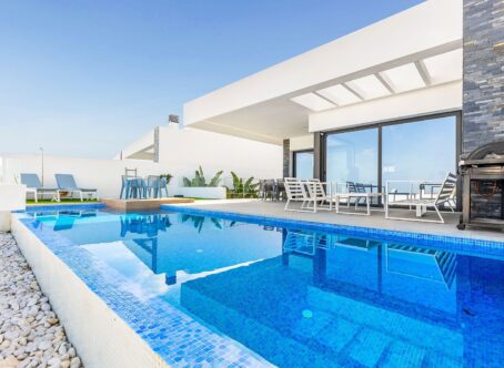 Modern Villa with Stunning Sea and City Views This stylish villa, built in 2019, features a modern design and high-quality finishes, offering 194 m² of living space. On the main floor, you'll find a spacious living-dining area with large windows that flood the space with natural light and provide breathtaking views of the sea and city. From here, you have direct access to the terrace and an infinity pool. This floor also includes the master bedroom with a walk-in closet and en-suite bathroom. The semi-basement floor offers a second living room, 2 bedrooms with en-suite bathrooms, a laundry room, and direct access to the garage. The property also includes a covered parking area. Key Features: Infinity pool with spectacular views3 bedrooms with en-suite bathroomsYear of construction: 2019Garage and covered parkingModern design with high-quality finishes A unique villa to enjoy luxury, stunning views, and tranquility in a privileged location. Request more information and schedule a visit!
