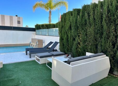 Luxury modern villa with a large plot and private garden, including a swimming pool and private parking.It has 3 bedrooms and 3 bathrooms, located on two floors, with a magnificent solarium, the total area of the house is 137 m2, the terrace area is 114m2, the plot area is 312m2A gated Mediterranean complex with a large green area and three swimming pools, located in the elite part of Ciudad Quesada, Donna Peppa district, surrounded by new modern houses. The bungalow has its own yard and its own Parking. Nearby there are several supermarkets, 3 Schools, kindergartens, a Sunday market with the freshest farm products, bars and restaurants within walking distance!