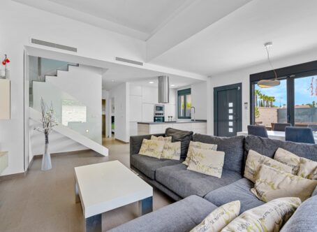 Detached villa in the sought-after area of Ciudad Quesada, built in 2013 and maintained in excellent condition. With 120m² of living space on a 200m² plot, the property offers a private pool, off-road parking, and modern features throughout. The home is sold fully furnished and has been recently repainted. It includes 3 bedrooms and 2 bathrooms, both equipped with underfloor heating. Centralized air conditioning is installed across the entire house. On the ground floor, there is one bedroom, a spacious living-dining area with an open-plan kitchen, and a bathroom. The upper floor features two additional bedrooms, a bathroom, and access to a private solarium with stunning views and unforgettable sunsets. Ideally located just minutes from a supermarket and only a 5-minute drive to the center of Quesada, this villa is perfect as a permanent residence, holiday home, or investment opportunity.