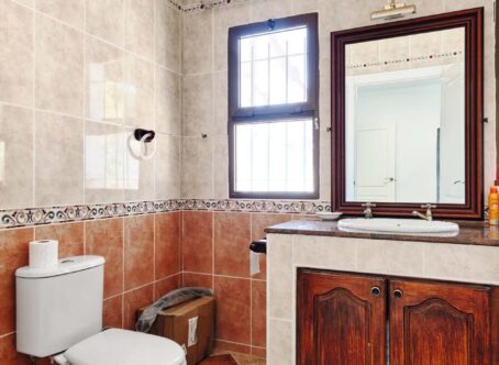 Detached three-bedroom, three-bathroom villa with private pool and garage, located within walking distance of amenities in Pinar de Campoverde. The property sits on a 1,100 m² flat plot close to the Rio Seco Natural Park and approximately 10 km from the beaches of Torre de la Horadada and Mil Palmeras. Access to the plot is via a sliding gate leading to a long driveway bordered by mature planting. To the left is the private pool with ample surrounding space. The villa is entered from a half-covered front terrace overlooking the pool and garden. The front door opens into an open-plan kitchen and dining area. The kitchen has generous storage and has been recently updated. An archway leads to the living room with large windows and a media feature wall. A hallway from the kitchen connects to a guest bedroom with en suite and the main bedroom with air conditioning, garden access, and a large en suite with bath and walk-in shower. A glass door from the dining area leads to stairs up to the third bedroom, which has patio doors to a small terrace and its own en suite bathroom. The exterior is mostly paved for low maintenance, with established plants throughout. At the rear is a storage room with WC and plumbing for a washing machine. The garage is positioned on the right side of the villa and offers storage or potential conversion. Additional features include a roof solarium, a private and well-screened plot, and a quiet setting within easy reach of local services.