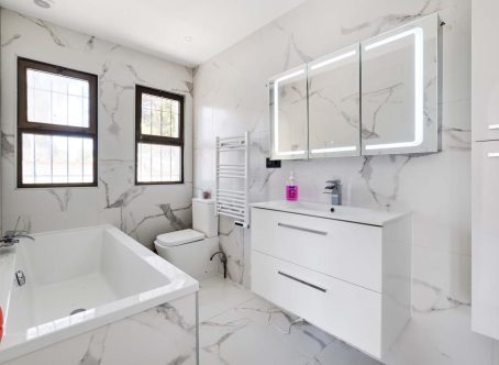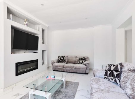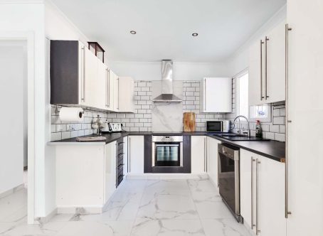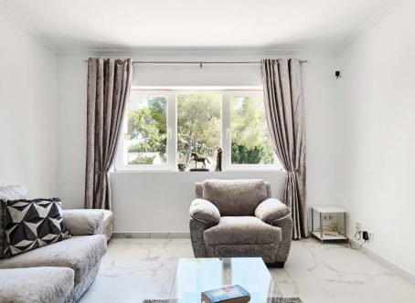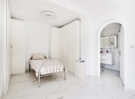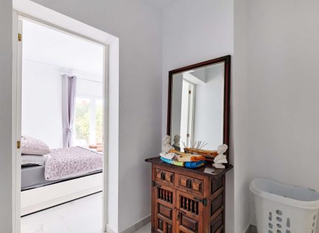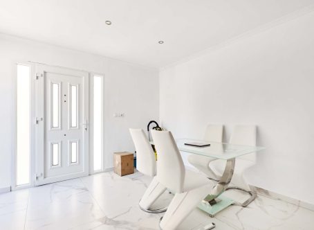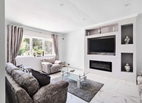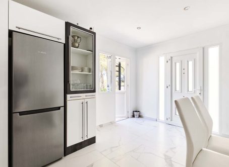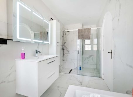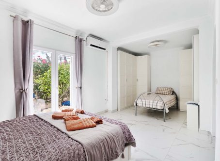 Detached three-bedroom, three-bathroom villa with private pool and garage, located within walking distance of amenities in Pinar de Campoverde. The property sits on a 1,100 m² flat plot close to the Rio Seco Natural Park and approximately 10 km from the beaches of Torre de la Horadada and Mil Palmeras. Access to the plot is via a sliding gate leading to a long driveway bordered by mature planting. To the left is the private pool with ample surrounding space. The villa is entered from a half-covered front terrace overlooking the pool and garden. The front door opens into an open-plan kitchen and dining area. The kitchen has generous storage and has been recently updated. An archway leads to the living room with large windows and a media feature wall. A hallway from the kitchen connects to a guest bedroom with en suite and the main bedroom with air conditioning, garden access, and a large en suite with bath and walk-in shower. A glass door from the dining area leads to stairs up to the third bedroom, which has patio doors to a small terrace and its own en suite bathroom. The exterior is mostly paved for low maintenance, with established plants throughout. At the rear is a storage room with WC and plumbing for a washing machine. The garage is positioned on the right side of the villa and offers storage or potential conversion. Additional features include a roof solarium, a private and well-screened plot, and a quiet setting within easy reach of local services.