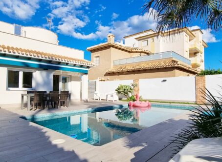 A newly renovated 4 bed 3 bath detached villa with a private swimming pool located just 100m from the beach in Playa Flamenca, Costa Blanca South. This property is offered for sale in very good condition as it has been renovated, sold furnished & very briefly consists of the following:- On the first floor there is a lounge/diner with hot and cold A/C, open plan kitchen, 3 x bedrooms & 2 x shower rooms. On the 1st floor is the main large double bedroom, shower room, large balcony & a private rooftop solarium. Outisde there is a large garden with a private swimming pool, outdoor kitchen with a barbecue area, chip and putting green, tool shed & off road parking. The beach is literally at the end of the road, just a 1 minute walk & local bars & restaurants are all just a short walk away. Murcia Corvera airport is a 35 minute drive & Alicante airport is 50 minutes drive.