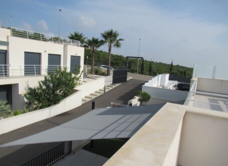5 bedroom villa with guesthouse. Beautiful ready-to-live villa with completely separate guesthouse. This with beautiful open views over the salt lakes and the Mediterranean Sea. Spacious furnished villa with 3 bedrooms and fitted wardrobes, 2 bathrooms and separate guest toilet, fully equipped kitchen, private swimming pool, covered terrace, air conditioning, intercom, roof terrace. At the front of the house you have your own parking space which offers enough space for 2 cars. This parking lot is closed with an electric gate. The many glass areas and large sliding windows, which not only provide a lot of natural light, make it seem as if the indoor and outdoor space form one whole. In the building you will find a fully autonomous guesthouse with separate entrance, a fully equipped kitchen, a living room and dining room, 2 spacious bedrooms with fitted wardrobes and both with an en-suite bathroom and a storage/laundry room These villas are located in San Miguel de Salinas. Located 10 minutes drive from the beaches of Punta Prima, Playa Flamenca, Cabo Roig and Campoamor. Close to the golf clubs of Las Ramblas Golf, Villamartin Golf, Las Colinas Golf & Country Club and Lomas De Campoamor Golf as well as close to supermarkets, restaurants and the shopping center of La Zenia Boulevard.