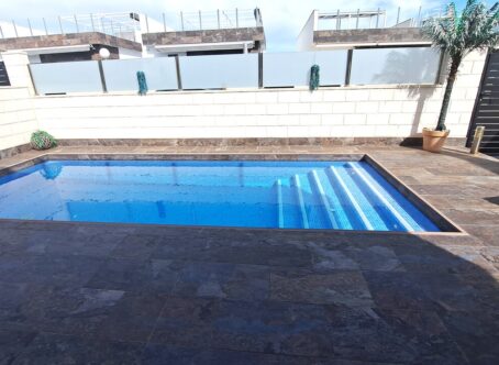 Stunning Modern Detached Villa in Pink Paradise, VillamartinIntroducing this newly built, detached villa, designed all on one level, located in the popular Pink Paradise development in Villamartin. Offering a combination of modern comfort and style, this property is ideal for those looking for a luxurious yet practical living space.Key Features:Exterior: North-Facing Garden A beautifully landscaped garden featuring a private pool, perfect for enjoying sunny days and outdoor relaxation. -Large Private Solarium: Offering additional outdoor space with breathtaking lake views, ideal for entertaining or unwinding in the serene surroundings. Electric Shutters: Convenient and secure electric shutters for added privacy and peace of mind.Interior: Spacious Living Room: A bright and airy living area equipped with ducted air conditioning to ensure year-round comfort. Open-Plan Kitchen: Fully fitted and integrated kitchen, perfect for modern living and entertaining guests with ease. Three Double Bedrooms: All bedrooms come with air conditioning, fitted wardrobes, and direct access to the garden. The master bedroom includes a ceiling fan and an ensuite shower room, providing a private and comfortable retreat. -Additional Shower Room: Serves the other two bedrooms, ensuring convenience for family and guests alike.Extras: - The villa is sold part-furnished, offering a solid foundation for new owners to personalize and make it their own.Why This Villa?This property is perfect for those seeking a modern, single-level home with exceptional outdoor and indoor living spaces. Its thoughtful design includes spacious bedrooms, open-plan living, and convenient features like air conditioning and electric shutters, ensuring a comfortable and secure environment. The private pool, solarium with lake views, and easy access to local amenities make this villa an ideal choice for both permanent living or as a holiday retreat.Don't miss out on this fantastic opportunity! Contact us today to arrange a viewing and experience the luxury and comfort of this stunning villa in Pink Paradise.