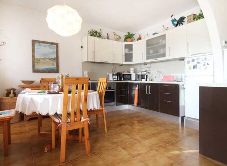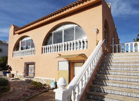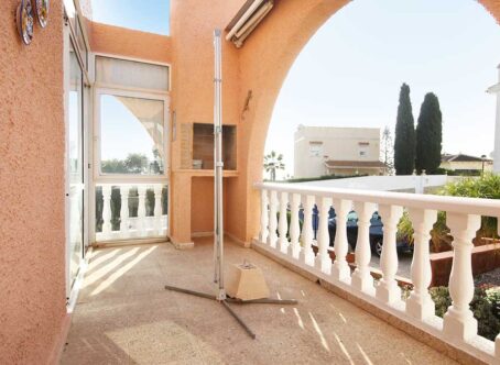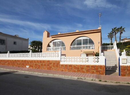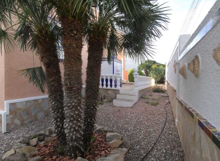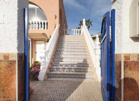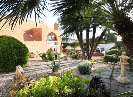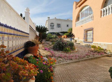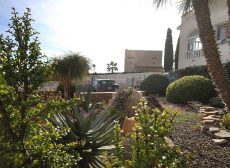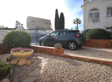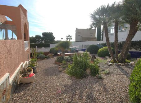 2 Bedroom Detached Villa on a 490m² Plot – Blue Lagoon, Villamartin This charming 2-bedroom detached villa is set on a generous 490m² plot in the peaceful residential area of Blue Lagoon, Villamartin. Surrounded by mature gardens filled with colourful flowers, shrubs, and trees, the property offers privacy, space, and plenty of potential. Access is via both front and rear pedestrian gates, plus a vehicle entrance leading to private off-street parking. A pathway from the main gate leads to a large front terrace and enclosed sunroom – a bright, spacious area ideal for relaxing year-round, with open views over the neighbourhood. Inside, the front door opens into a large open-plan living space, featuring a comfortable lounge area to the right and a fully equipped kitchen with dining area to the left. To the rear are two bedrooms and a family bathroom. Both bedrooms and the lounge include wall-mounted radiators, and the home benefits from gas central heating. An external staircase leads up to a large rooftop solarium boasting impressive views across the area towards the Mediterranean Sea. Beneath the terrace, there is a semi-underbuild currently used for storage but offering scope for further development, along with an additional storeroom at the back. Although the property does not currently have a pool, there is ample space to add one if desired. The surrounding villas also enjoy large plots, creating a pleasant sense of openness and privacy. Extras: Gas central heating · Mature garden · Large underbuild with potential · Space for private pool Location: Just a 5-minute drive to local bars, restaurants, and shops, and only 8 minutes from La Zenia Boulevard. Beautiful beaches and several top golf courses are also nearby. Alicante and Murcia International airports are both around a 45-minute drive away. This well-loved home offers comfort, generous outdoor space, and fantastic potential – an ideal permanent residence or holiday retreat.