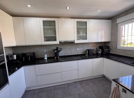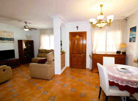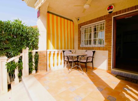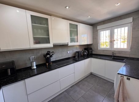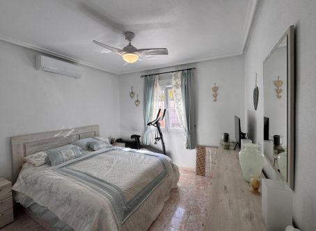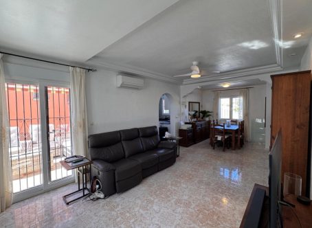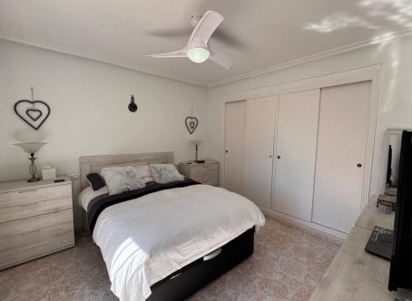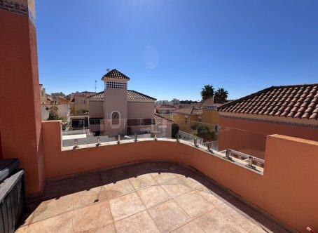 This beautiful south-facing detached villa sits on a 300?m² plot and features a large private pool, expansive terraces, and outdoor areas ideal for relaxing or entertaining year-round. The glazed entrance leads to a bright living room with built-in fireplace and dining area, opening onto a sunny south-facing terrace overlooking the pool. A fully fitted modern kitchen and a bedroom with fitted wardrobes, air conditioning, and new double-glazed windows complete the ground floor, along with a spacious family bathroom with double sinks. A marble staircase, illuminated by an ornate feature window, leads upstairs to a large south-facing bedroom with terrace access, fitted wardrobes, and air conditioning. Another generous bedroom with ceiling fans, air conditioning, and a second bathroom with shower and double sinks complete the upper floor.Only a short walk to shops, bars, and restaurants, with Campoamor Golf Course 5?minutes away and Orihuela Costa beaches just 10?minutes by car. Ideal for full-time living or as a holiday retreat. Properties like this are rare-contact us to arrange a viewing today.