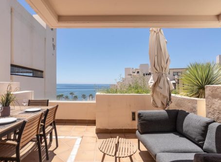 Fantastic lifestyle property by the beach and within a stroll to Estepona town center. Two bedroom duplex penthouse, on 3rd and 4th floor, in the frontline beach complex of Bahia de la Plata. South orientation with sea views and your own private pool on your private terrace. Entrance level with hallway, living and dining area, fully fitted kitchen with laundry, master bedroom en suite and a guest toilet. Direct access to the terrace. Upper floor, separate bedroom and bathroom, terrace with a private pool. The property has an underground garage space and storage room. The complex is gated and has 24 - hour security. There is an outdoor pool, an indoor heated pool, gymnasium, sauna and an indoor padel tennis court. The property is sold fully furnished. Frontline beach and walking distance to Estepona town center.